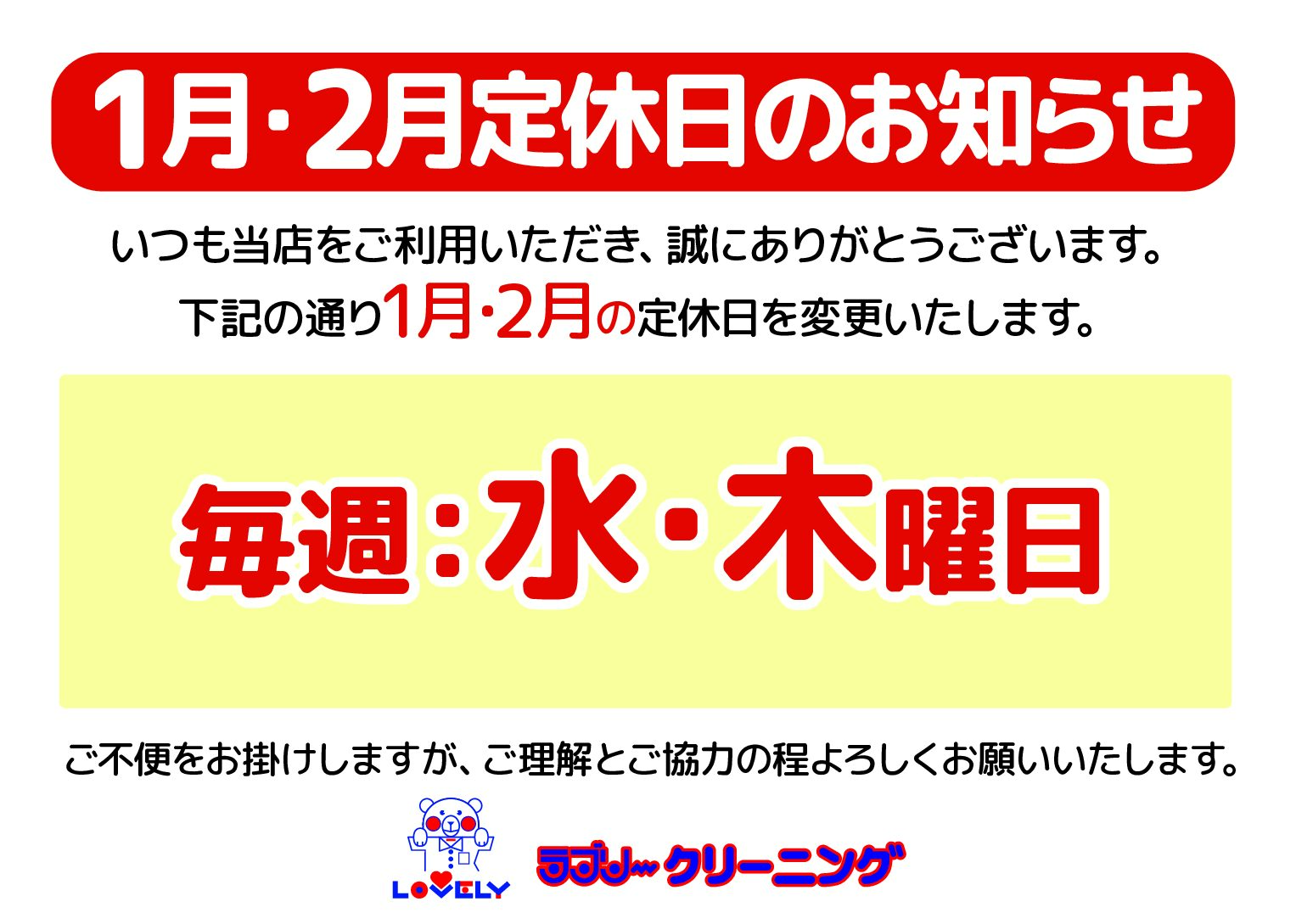 冬季定休日変更について(1月・2月)