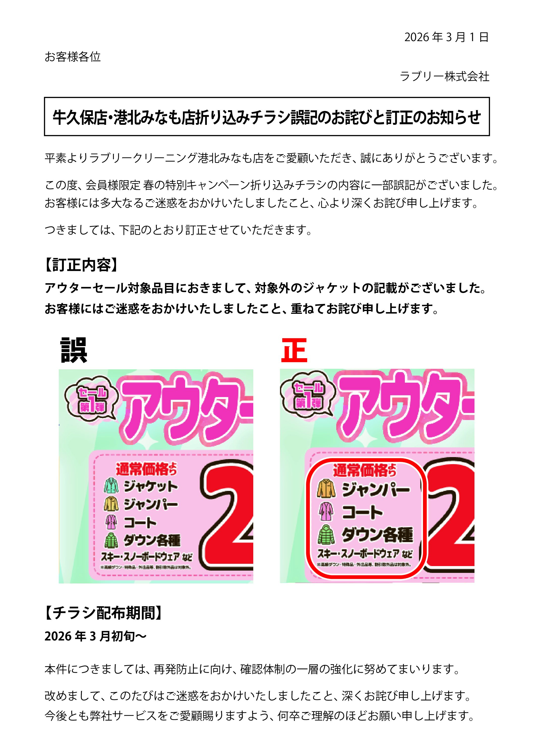 港北みなも店・牛久保店折込チラシ誤記のお詫びと訂正